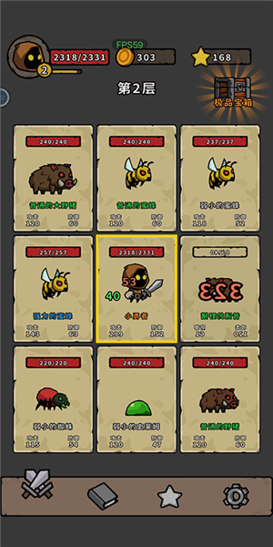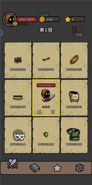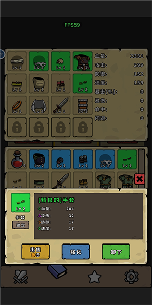 4、在点击下方的【装备】图标,进入【装备】页面,玩家也可对装备强化和出售,来提升角色的能力,这样能闯过更多关卡。