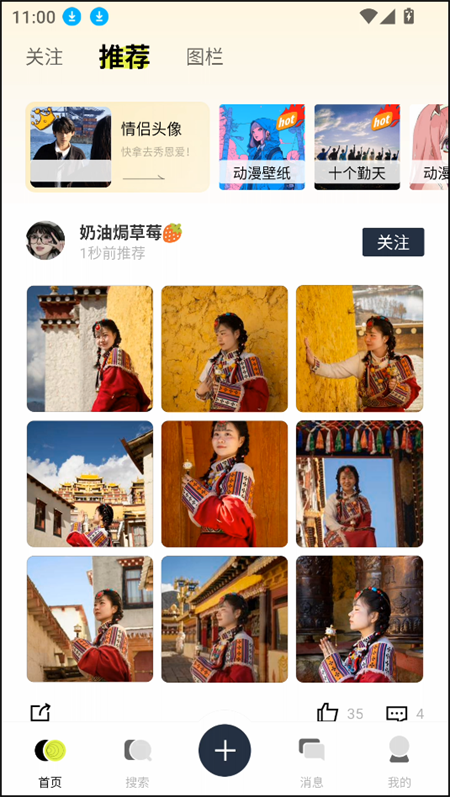 1、进入软件首页,可看到关注、推荐、图栏等一系列功能板块,布局清晰易懂。