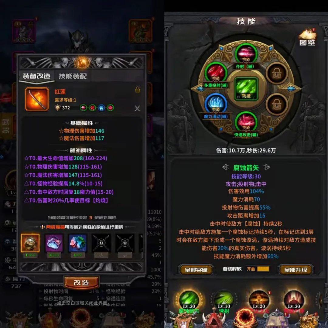 2.带上神器红莲一路推图,打BOSS没多大技巧,会跳就好,前期40级前的装备有啥带啥,白的装备动手改装到紫的就好,词条出现下面图里两三条能用的就好,不要管T几的,有就行了,升级最重要,提前把下个等级段的白装预留好。首饰技能必选愤怒光环,戒指优先选择正义之火,除了波动之意,其他3个技能前期也都可以带。愤怒光环技能能升级尽量升级,戒指技能到10级就先不要再往上升了。