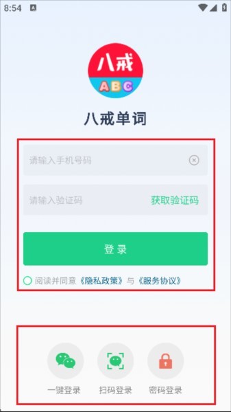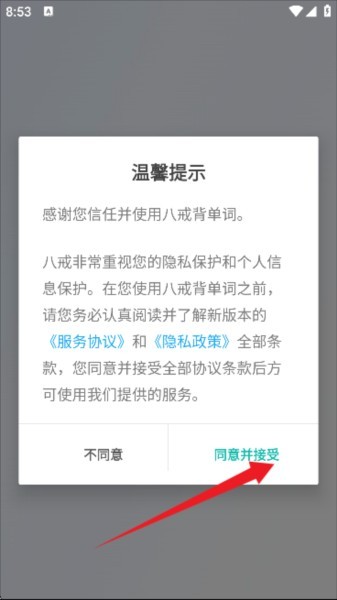1、打开已安装的八戒单词APP,先点击同意用户协议与隐私政策,完成软件初始授权,即可进入下一步操作。