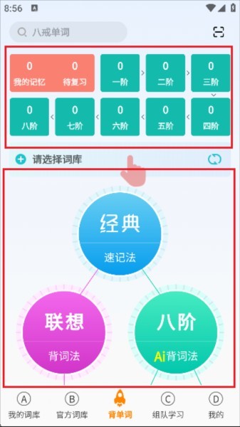 3、登录成功后,背单词界面提供1阶到8阶全阶段学习内容,同时配备经典、联想两种背词方法,可按需选择。