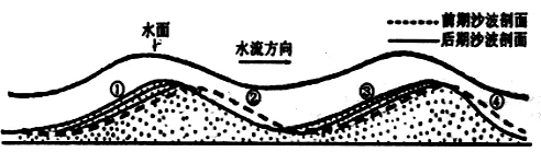 沙波是河流浅水区河床中的沙粒堆积地貌,下图示意某常见的沙波形成过程。在浅水区,水面受河床底部起伏影响呈波形,水流流速受上坡和下坡影响存在差异,进而导致沙波背水坡泥沙被侵蚀,而被侵蚀的泥沙会在下一个沙波的迎水坡堆积,读图回答下列问题。