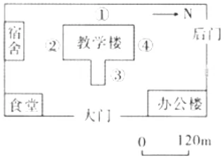 1.B【解析】图示地以为我国,正午时太阳位于正南,①停车场位于太阳曝晒下,不适合停车,A错误;③地位于办公楼的西南方向,C项错误;一年中观侧太阳升起的方向有东北、正东与东南,教学楼朝向④的窗户不能全部观测到,D项错误;根据比例尺可以确定B项正确。