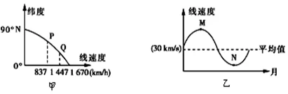 读地球自转线速度随纬度变化图(甲图)和地球公转线速度变化图(乙图),回答下面小题。