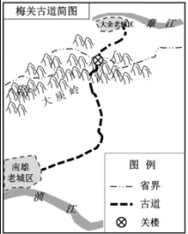 梅关古道位于江西省大余县与广东省南雄市交界处,是全国保存最完整的古驿道。历史上,梅关古道是广东和外界联系的主要通道之一,下图为“梅关古道与关楼景观图”,读图完成下列问题。