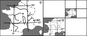 读世界某区域图,其中①②③图均表示同一区域,且其图幅依次减少四分之三。读图,回答下面小题。