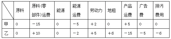 下表表示有生产联系的甲、乙两个工厂单位产品部分成本在过去10年间的变化(+10表示增加10%,-10表示减少10%,0表示没有变化)。完成下面小题。
