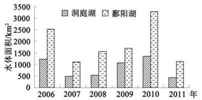 下图是2006-2011年各年5月中下旬长江中游洞庭湖和鄱阳湖水体面积变化对比图。读图回答下面小题。