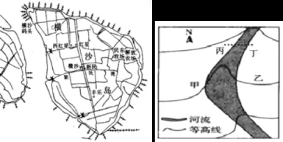 在海边或河流边,我们有时会看到如下图的水工建筑,那就是“丁坝”。因为它一端与海(河)岸相接,另一端伸到水域中,与堤岸构成“丁”字形,因此叫“丁坝”。读以下两图,回答下面小题。