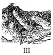 (4)由上题分析可知,乙为断层,岩层破碎,易侵蚀,在甲、乙、丙三地中最可能发育成河流。在河流上游的山区段,河流主要表现为向下侵蚀,形成V型谷。我国位于北半球,地砖偏向力向右,自西向东流,河流的南岸为右岸,若只考虑地砖偏向力,河流的南岸侵蚀严重。