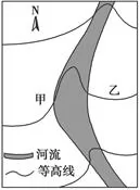 (1)由右图甲地的陆地轮廓和地形起伏情况可以判断此处为冲积扇地貌。分析其成因主要考虑流水作用和地形因素,河流流经昆仑山地时,由于山区内地势陡峭,水流速度快,携带了大量砾石和泥沙。当水流流出谷口时,由于地势突然趋于平缓,水流速度放慢,河流搬运的物质逐渐堆积,形成洪(冲)积扇。