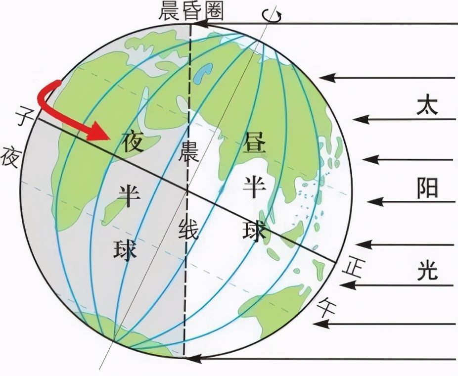 由于地球自转,并且地球既不发光也不透明,因此产生了昼夜交替。白昼与黑夜的分界线,叫做“晨昏线”。顺着地球自转的方向(自西向东):