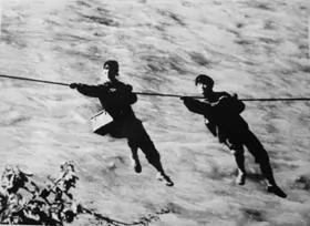 我国20世纪80年代末以前历次抗震救灾工作都大体如此,只是唐山地震灾害最重,成立的抗震救灾指挥部的级别最高,派出解放军和动员省内外支援的队伍规模最大,任务更重,成绩更引人瞩目。1976年松潘、平武7.2级地震发生在川西高原,图8-33至图8-35是当年解放军在高山峡谷地区抗震救灾的照片。