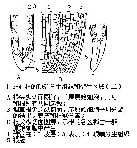 根的顶端分生组织包括原分生组织和初生分生组织。原分生组织位于前端,由原始细胞及其最初的衍生细胞构成,细胞较少分化;初生分生组织位于原分生组织后方,由原分生组织的衍生细胞组成,这些细胞已出现了初步的分化,在细胞的形状、大小及液泡化等方面显出差异,分化为原表皮、基本分生组织和原形成层三部分。原表皮位于最外层。以后发育为表皮;原形成层位于中央,以后发育成维管柱;基本分生组织位于原形成层和原表皮之间,以后发育成皮层。