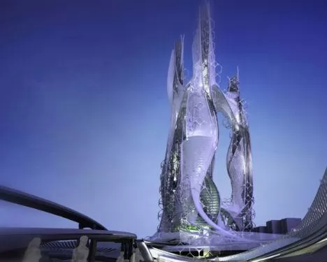 由瓦汉·米萨坎(Vahan Misakyan)设计的“百变摩天大楼”(Evolving Skyscraper),因对流动外形做出了非同寻常的排列,令其看上去像是来自于另一个星球:它肯定与地球上的所有建筑不一样。三个弯曲的波状塔楼与顶端的结构有机地结合在一起,而适于居住的桥形结构贯穿其中。这座摩天大楼设计用于各种各样的用途,比如居住、办公和休闲娱乐,表面覆盖着“智能皮肤”,不仅可以吸收太阳能为整栋大楼供电,还可以收集雨水,控制进入楼内的光线。