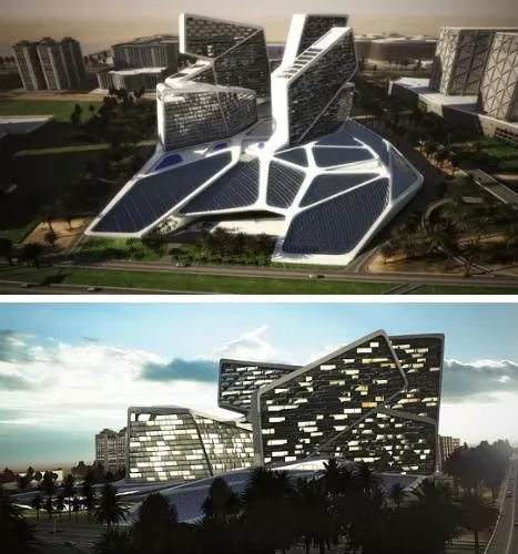 在迪拜的沙漠中,怎样能在充分利用太阳能发电的同时,避免建筑物内部过热?一个解决方案是设计能给自己遮荫的建筑。由Graft公司设计的垂直农庄非常独特,底部覆盖太阳能电池板,而塔楼则采用呈对角线的平板形,以减少下面的阳光渗透。塔楼内可以住人,而地下则有电影院、餐厅和商店。
